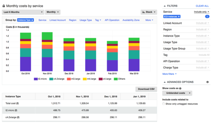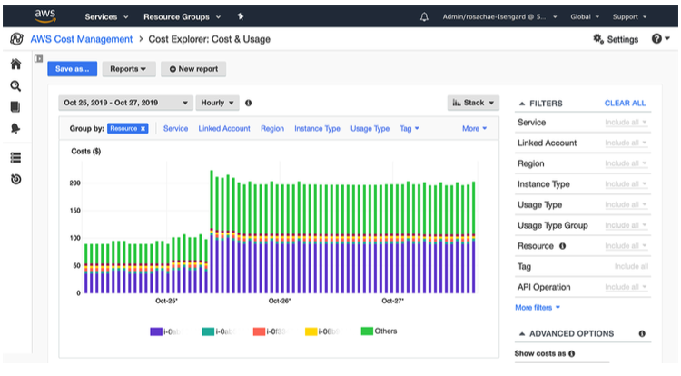 - 필터링 기준: 서비스, 연결 계정, 태그, 구매 옵션, 인스턴스 유형, 지역, 가용 영역, API 작업 등..