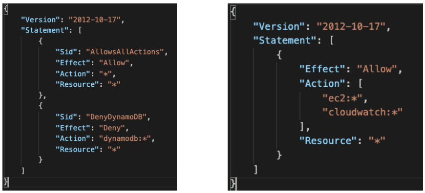 - 좌측 이미지의 경우 모든 액션을 허용하지만 DynamoDB에 대한 접근은 제한된다.