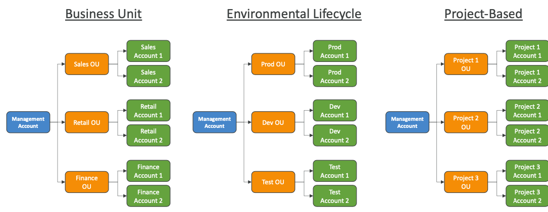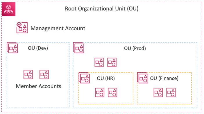 - 개발 환경 라이프사이클에 맞게 운영 OU, 개발 OU, 테스트 OU로 나누고 해당 OU에 회원 계정을 포함시킬 수 있다.