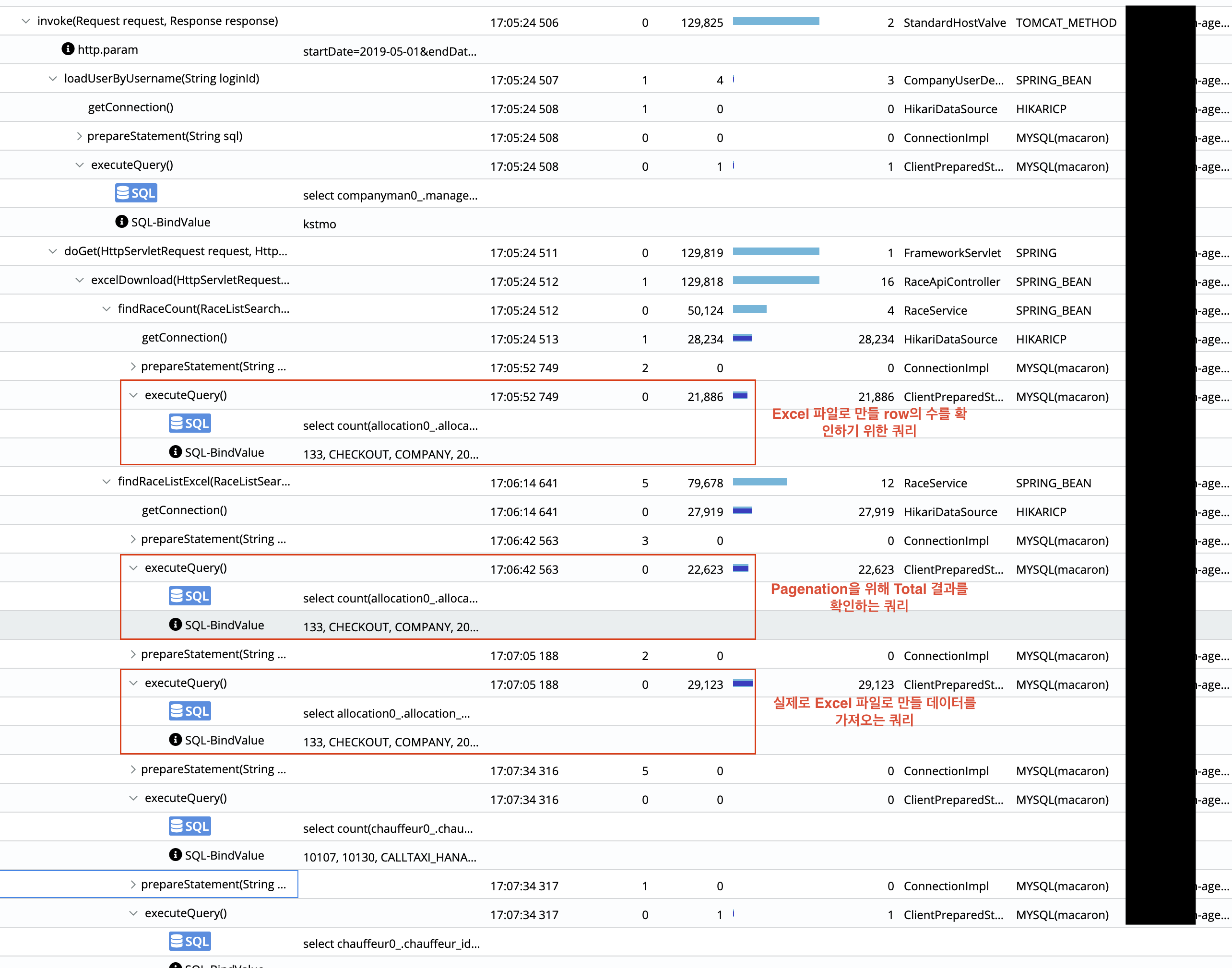 해당 API는 최초에 사용자의 요청이 들어오면 최대 다운로드 가능량 (작성일 기준 5000건)을 초과하지 않는지 count 쿼리를 실행한다. 만약 최대 다운로드 가능량을 초과하지 않았다면 실제로 데이터를 뽑아온다. 여기서 overhead가 발생한다. 다시 위의 이미지를 확인해보면 시간이 오래 걸리는 작업은 아래의 목록과 같다.