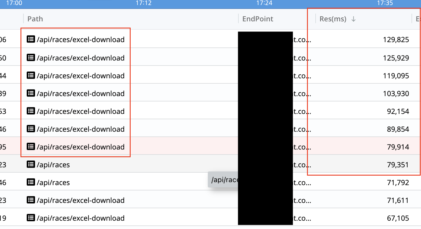 벤치마크를 진행하는 도중 가장 오랜 시간이 걸린 요청을 내림차순으로 정렬해보면 /api/races/excel-download 인 것을 확인할 수 있다.