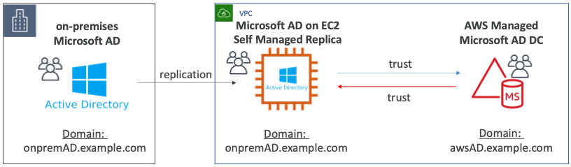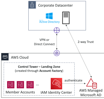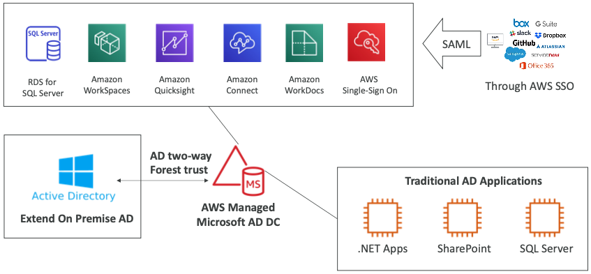 - Microsoft Active Directory와 기업의 데이터 센터와 통합하고 싶다면 AWS Managed Microsoft AD를 생성하고 2-way Trust를 생성하면 된다.