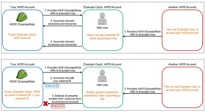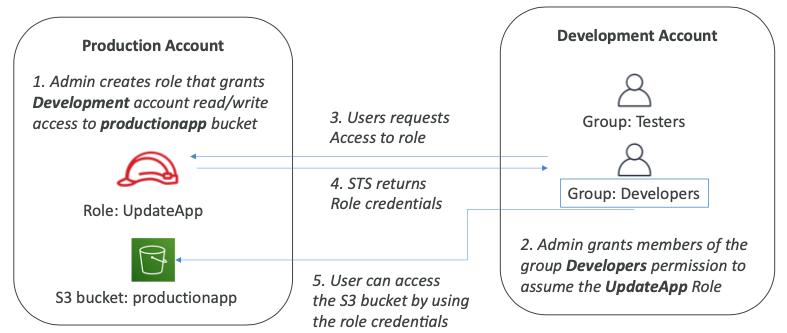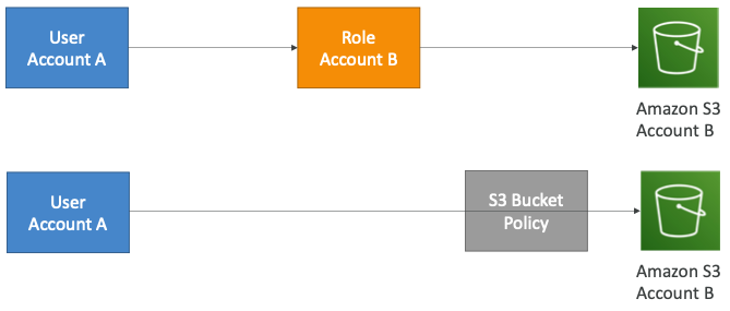 - 첫 번째는 "계정 A"가 "계정 B"의 역할을 가지고 "계정 B"의 S3 버킷에 접근한다.
