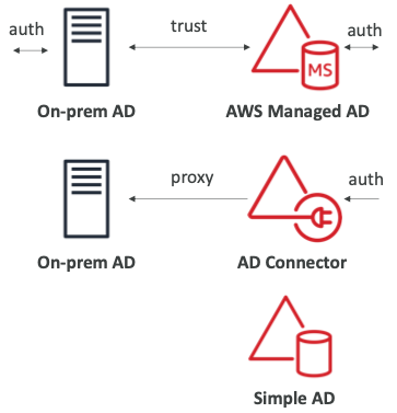 - Managed Microsoft AD: 독립 실행형 또는 온프레미스와의 셋업 트러스트 AD, MFA, Seamless Join, RDS 통합 기능이 있다.