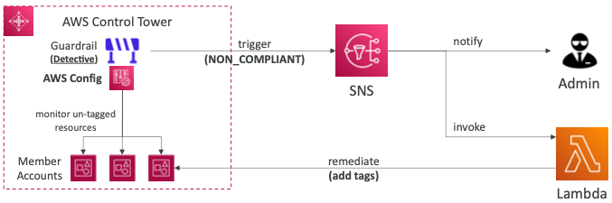 - 규정 비준수 리소스가 검출되면 SNS를 통해 관리자에게 알림을 전송하고 람다 함수를 실행하여 규정을 준수하도록 태그를 추가할 수 있다.