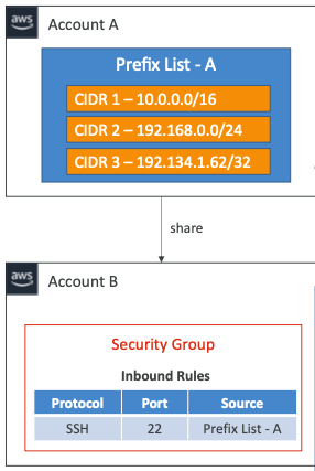 - 보안 그룹을 생성할 때, 보안 그룹에 모든 CIDR를 추가하는 것이 아니라 "Prefix List A"를 참조하도록 할 수 있다.