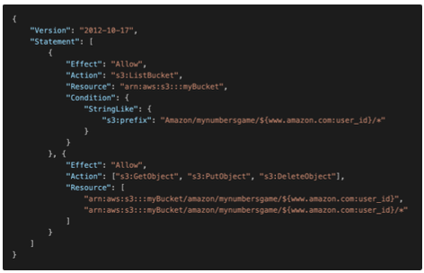 ${aws:username}: 흔하게 사용되는 변수로 AWS 사용자의 이름을 가져올 수 있다."Resource":["arn:aws:s3:::mybucket/${aws:username}/*]