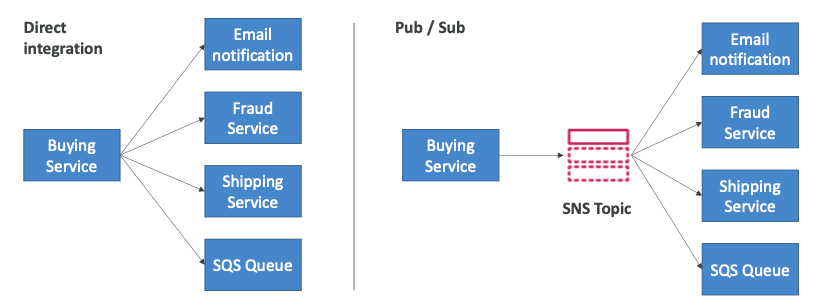 - 만약 Pub/Sub 방식으로 SNS 토픽을 사용하고 메시지를 소비해야 하는 새로운 소비자가 추가된다면 기존의 코드는 변경할 필요없이 새로운 소비자가 SNS 토픽을 바라보도록 구현하면 된다.