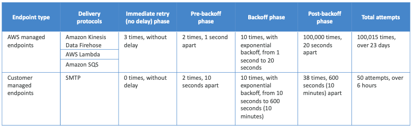 - 고객 관리형 엔드포인트의 경우 SMTP 프로토콜을 사용하고, 실패하는 경우 재시도하지 않는다.