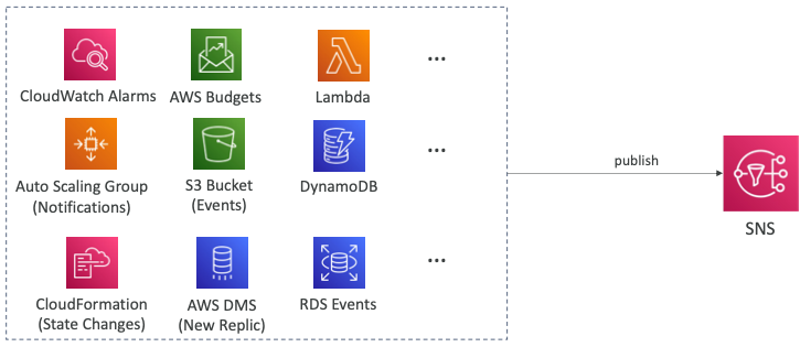- 많은 AWS 서비스는 알림을 위해 데이터를 SNS로 직접 전송할 수 있다.
