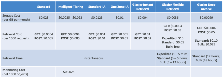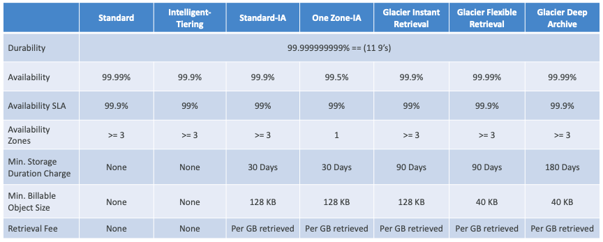 - Amazon S3 One Zone-Infrequent Access (S3 One Zone-IA)