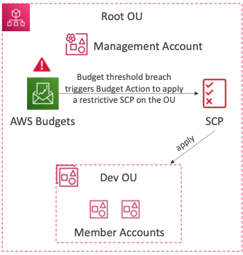 - 예산이 특정 임계값에 도달하면 "Dev OU"에 자동으로 SCP를 적용해서 "Member 계정"을 제한할 수 있다.