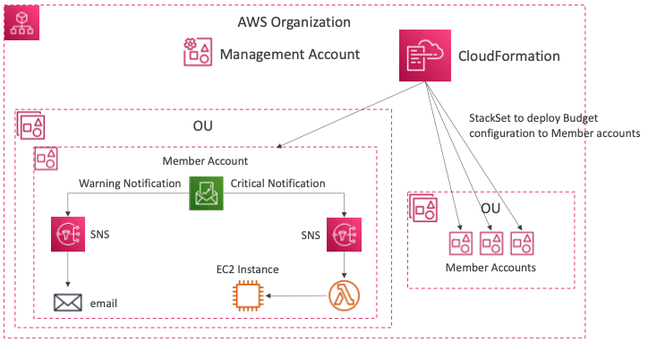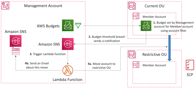 - 예산이 임계값을 초과하면 중앙에 있는 계정의 SNS에 알림을 보낼 수 있고, 해당 알림은 람다 함수를 트리거한다.