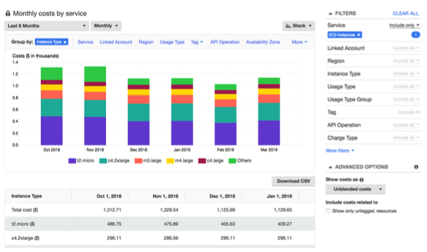 - 서비스, 링크된 계정, 태그, 구매 옵션, 인스턴스 유형, 리전, 가용 영역, API 작업 등으로 필터링할 수 있다.
