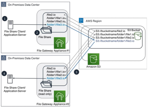 - 다른 온프레미스 데이터 센터에서는 읽기 전용 복제를 만들어서 파일 시스템, 애플리케이션 서버가 파일 게이트웨이 어플라이언스의 읽기 전용 복사본을 읽을 수 있도록 할 수 있다.