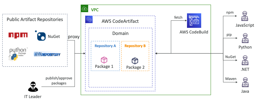 - IT 리더 또는 개발자가 패키지를 게시 및 승인하여 CodeArtifact의 여러 리포지토리에 업로드할 수 있다.