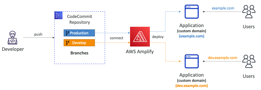 - CodeCommit에 연결하여 브랜치당 하나씩 배포한다.