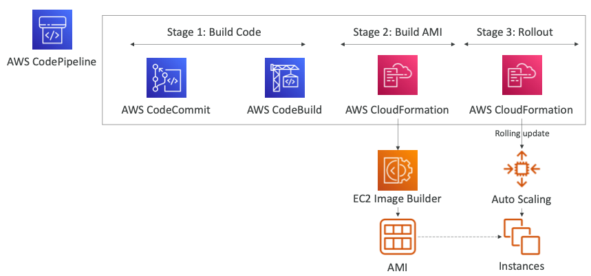 - 예시에서는 CloudFormatoin을 사용하고 이는 자동으로 EC2 Image Builder 서비스를 실행한다.