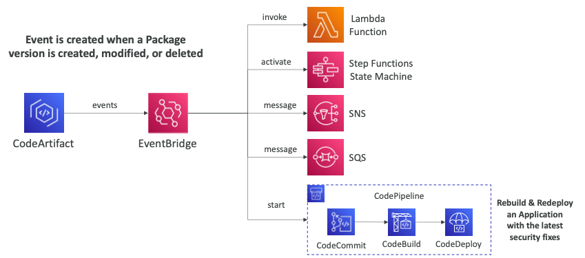 - CodeArtifact는 패키지가 생성되거나 변경되거나 삭제됐을 때, EventBridge로 이벤트를 전송한다.