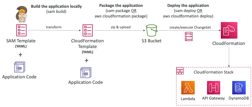 CloudFormation이 람다 함수, API Gateway, DynamoDB를 배포한다.