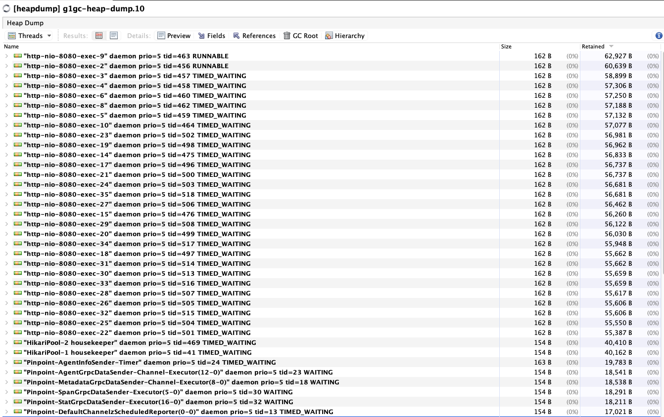 - Retained Heap: 한 객체가 제거될 때 함께 제거될 수 있는 객체들이 점유한 Heap의 크기. 자신이 GC 될 때 함께 GC 될 수 있는 참조하고 있는 객체의 메모리의 크기.