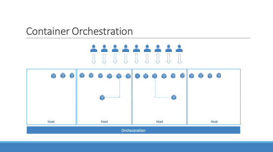 - 플랫폼은 컨테이너 간의 연결을 조정하고 부하에 따라 자동으로 확장 또는 축소해야 하며, 컨테이너를 자동으로 배포하고 관리하는 전체 프로세스를 컨테이너 오케스트레이션이라고 한다.