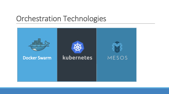 - 쿠버네티스를 이러한 오케스트레이션 기술이라고 하며 Docker Swarm, Mesos와 같은 여러 기술들이 있다.