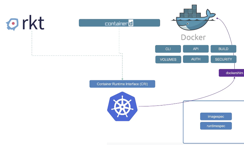 - 하지만 사용자들이 도커를 여전히 사용했기 때문에 쿠버네티스는 "dockershim"을 도입하여 도커를 지원했지만 어디까지나 CRI 인터페이스 밖에서 도커를 계속 지원하는 임시 방법이다.