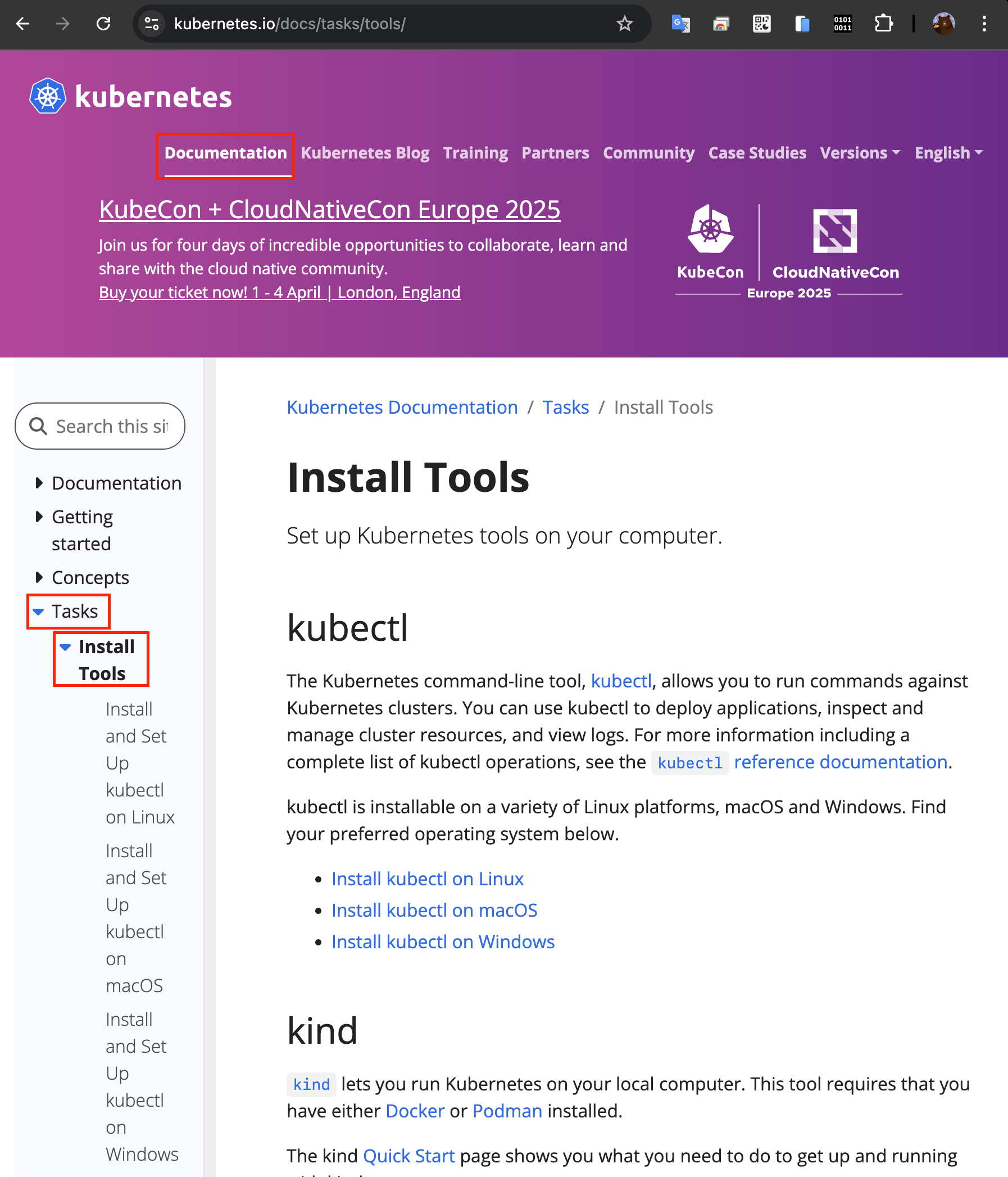 - 쿠버네티스 공식 홈페이지로 이동하여 "Documentation" -> "Tasks" -> "Install Tools"를 선택한다.
