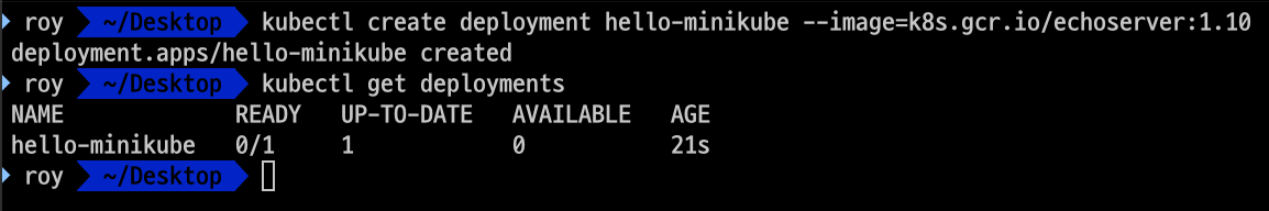 kubectl create deployment hello-minikube --image=k8s.gcr.io/echoserver-arm:1.8 명령어를 입력하여 "hello-minikube"라는 이름의 디플로이먼트를 생성한다.