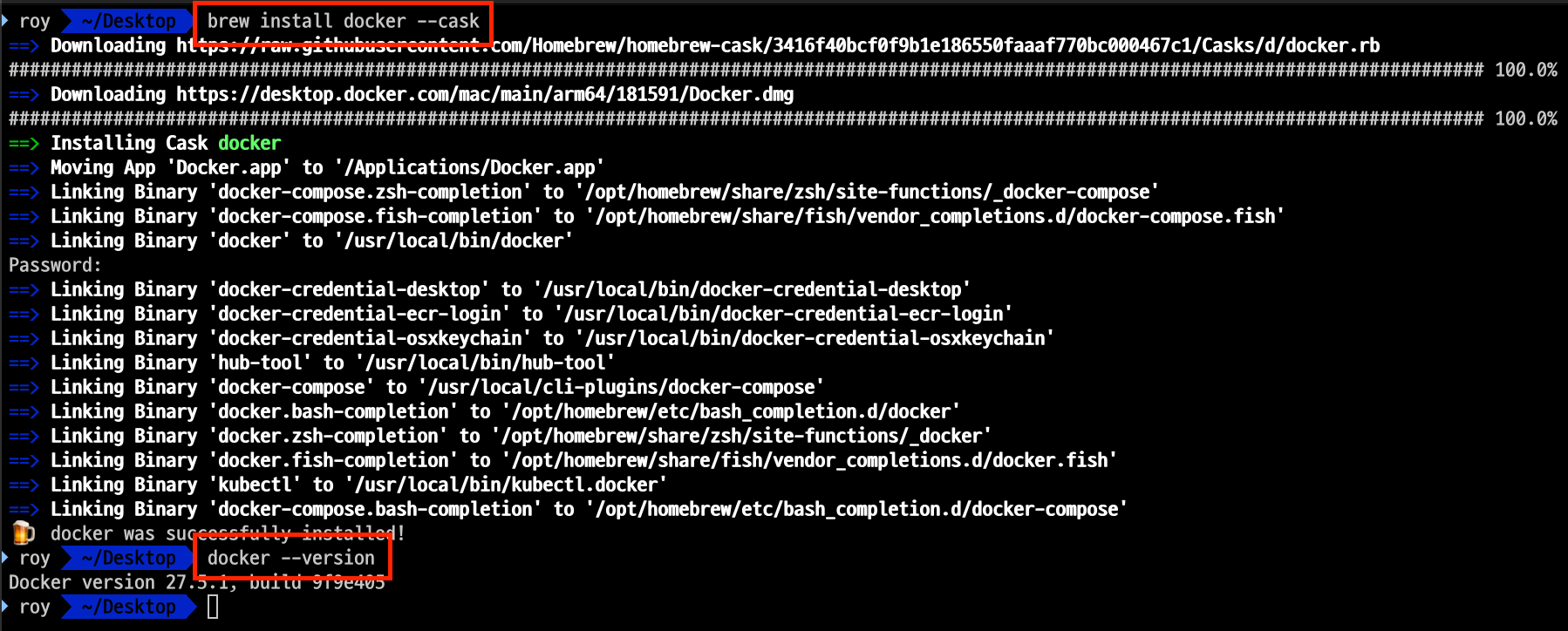 brew install --cask virtualbox 명령어를 입력하여 "docker"를 설치하고 docker --version 명령어를 입력하여 정상적으로 설치되었는지 확인한다.