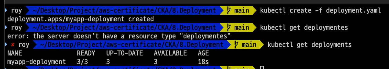 kubectl create -f deployment.yaml 명령어를 입력하여 "Deployment"를 생성한다.