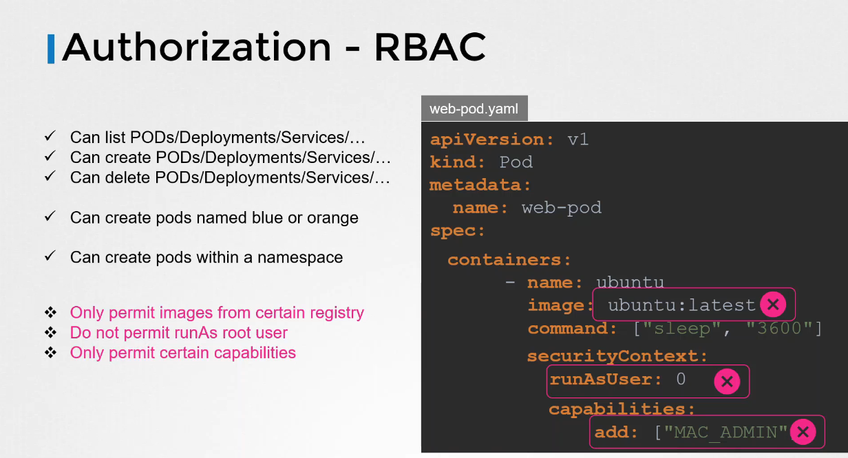 - 세밀한 설정(예: 특정 이미지 사용 제한, 보안 설정 강제)은 RBAC만으로 구현하기 어렵다.