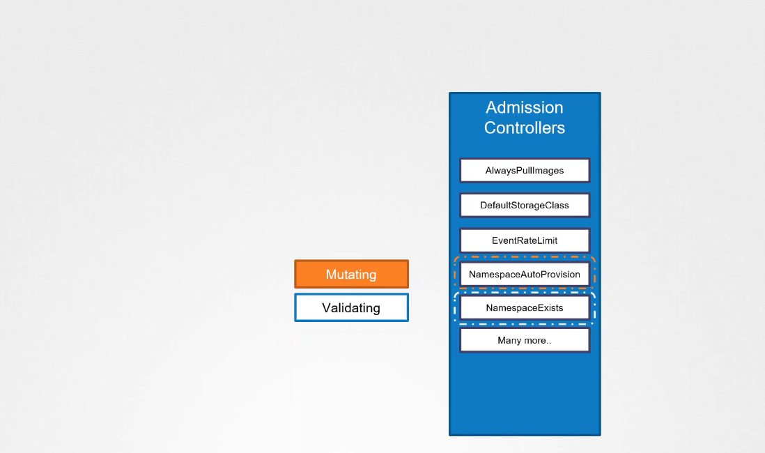 - 예: NamespaceAutoProvisioning (mutating) -> NamespaceExists (validating)