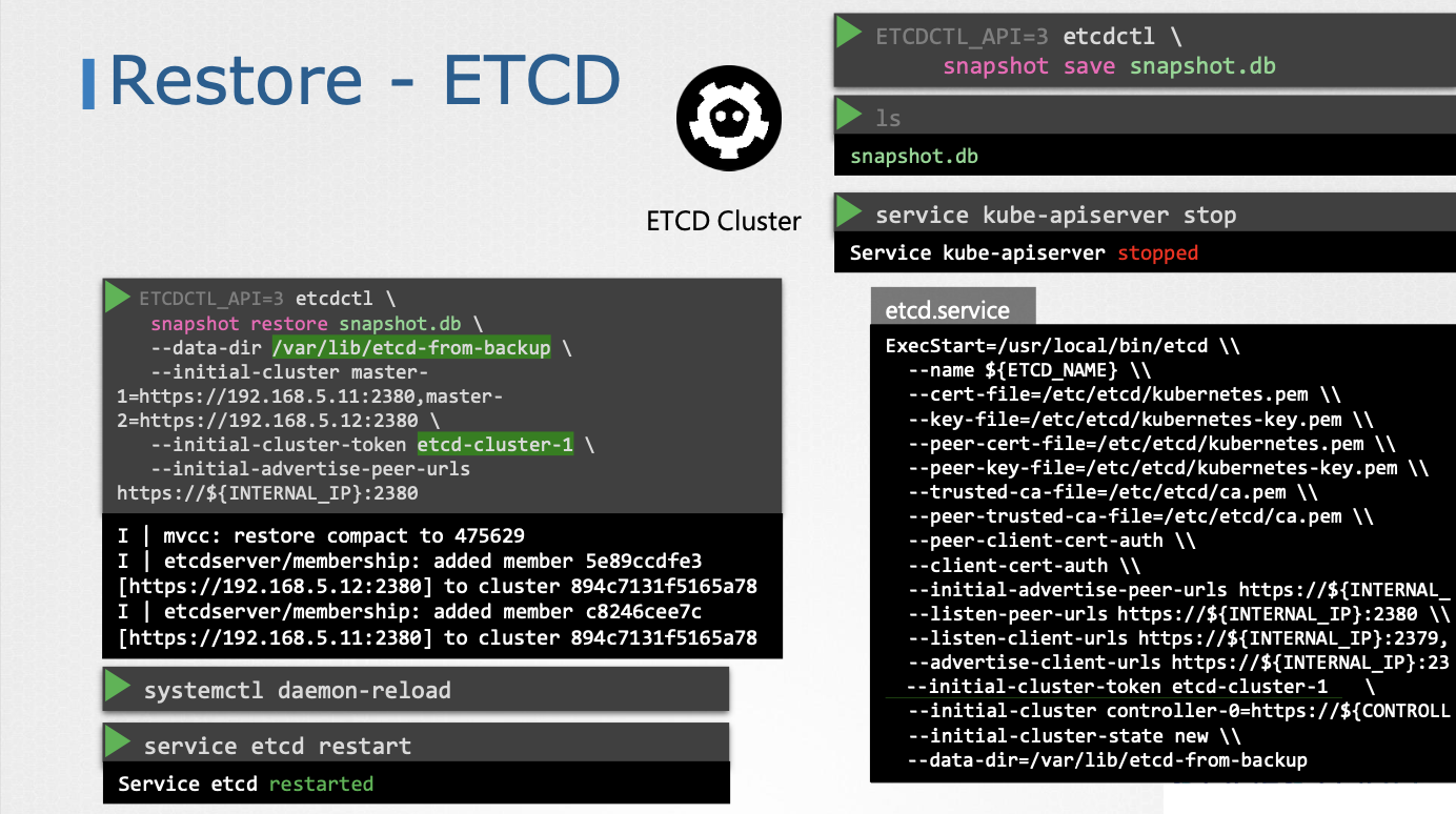 etcdctl snapshot restore snapshot.db --data-dir=/var/lib/etcd-from-backup(새로운 데이터 디렉터리 지정) - etcd 구성 파일 수정: