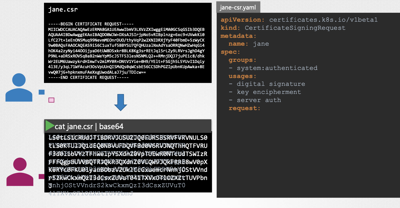 - 새로운 관리자가 클러스터에 접근하려면 관리자에게 CSR(Certificate Signing Request)을 전달해야 한다.