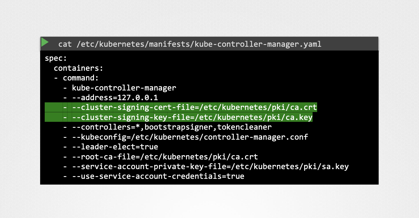 kube-controller-manager서비스 설정에는 CA 루트 인증서와 개인키 경로를 지정하는 옵션이 있다.