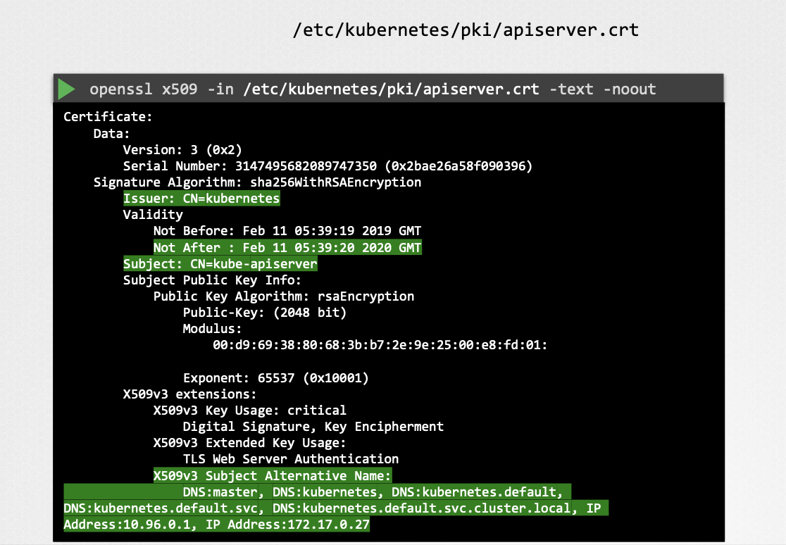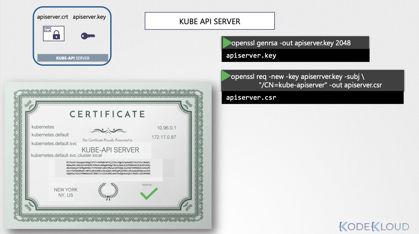 - 대체 이름 (Alternate Names) 설정: kube-apiserver는 다양한 이름과 IP 주소로 접근할 수 있으므로, 인증서에 모든 대체 이름을 포함해야 한다.