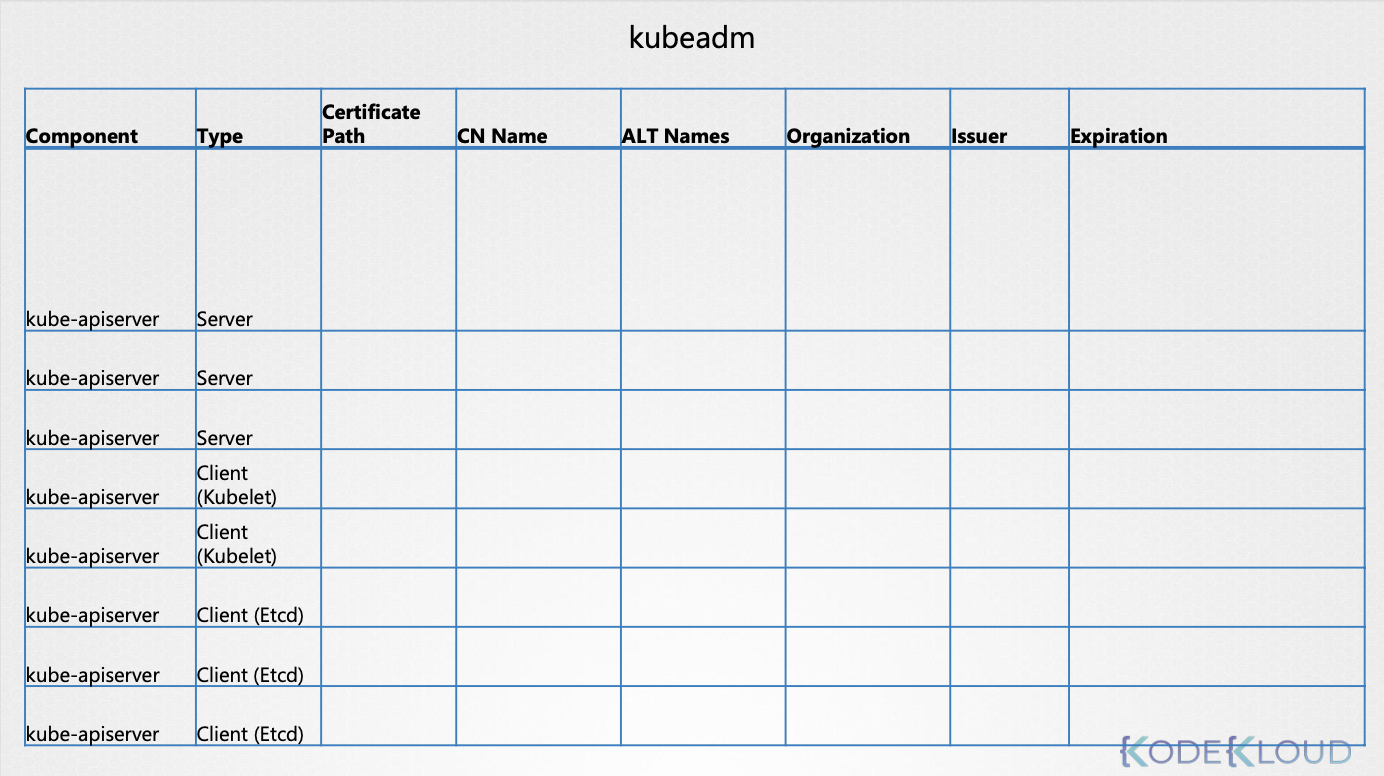 - CA 인증서, 서버 인증서, etcd 서버와의 통신을 위한 클라이언트 인증서, kubelet 서버와의 통신을 위한 클라이언트 인증서를 지정한다.