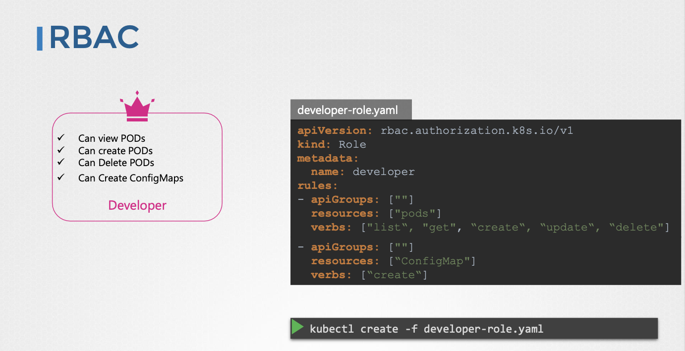 apiVersion:rbac.authorization.k8s.io/v1kind:Rolemetadata.name: 역할 이름 (예:developer)rules: 권한 규칙 목록apiGroups: API 그룹 목록 (코어 그룹은 빈 문자열)resources: 리소스 목록 (예:pods,configmaps)verbs: 동작 목록 (예:list,get,create,delete)