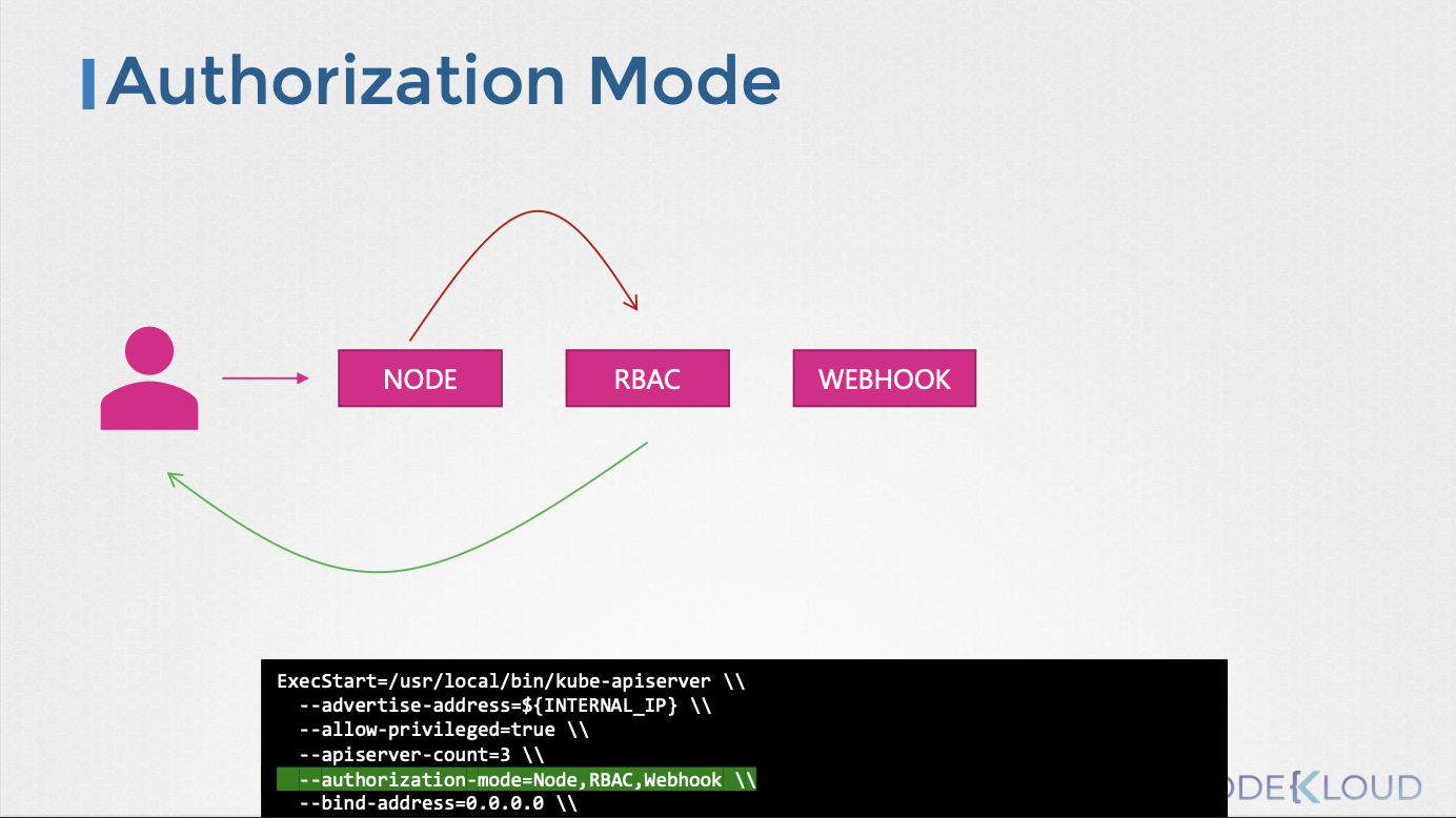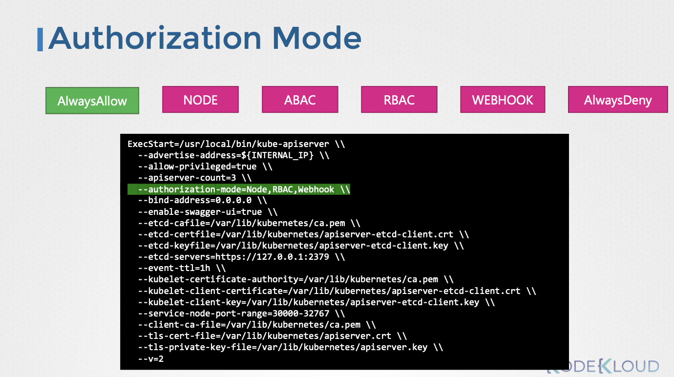 --authorization-mode=Node,RBAC,Webhook)