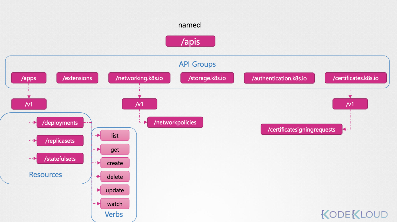 kubectl유틸리티나 REST API를 통해 API 서버와 통신하여 클러스터 작업을 수행한다.- API는 다양한 목적으로 그룹화되어 있으며, 각 그룹은 특정 기능을 담당한다.