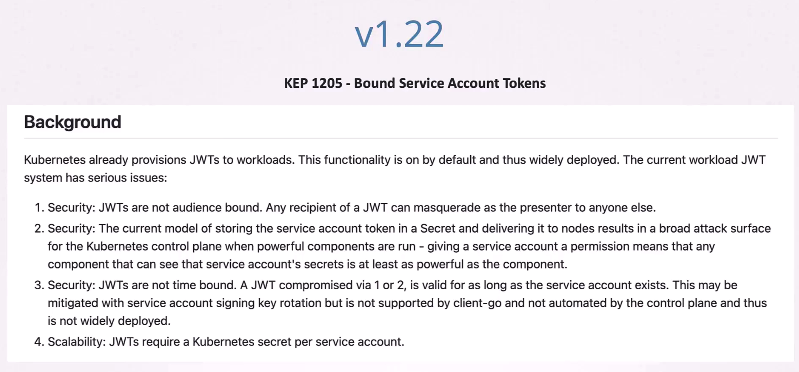 - 기존의 서비스 계정의 Secret이 직접적으로 마운트 되는 방식에서, 토큰 요청 API를 통해 토큰을 발급받아 프로젝티드 볼륨에 마운트하는 방식으로 변경되었다.