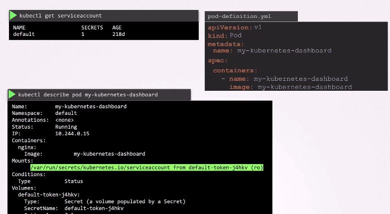 - 파드가 생성되면 서비스 계정이 자동으로 연결되고 토큰이 파드 내부의 특정 위치(