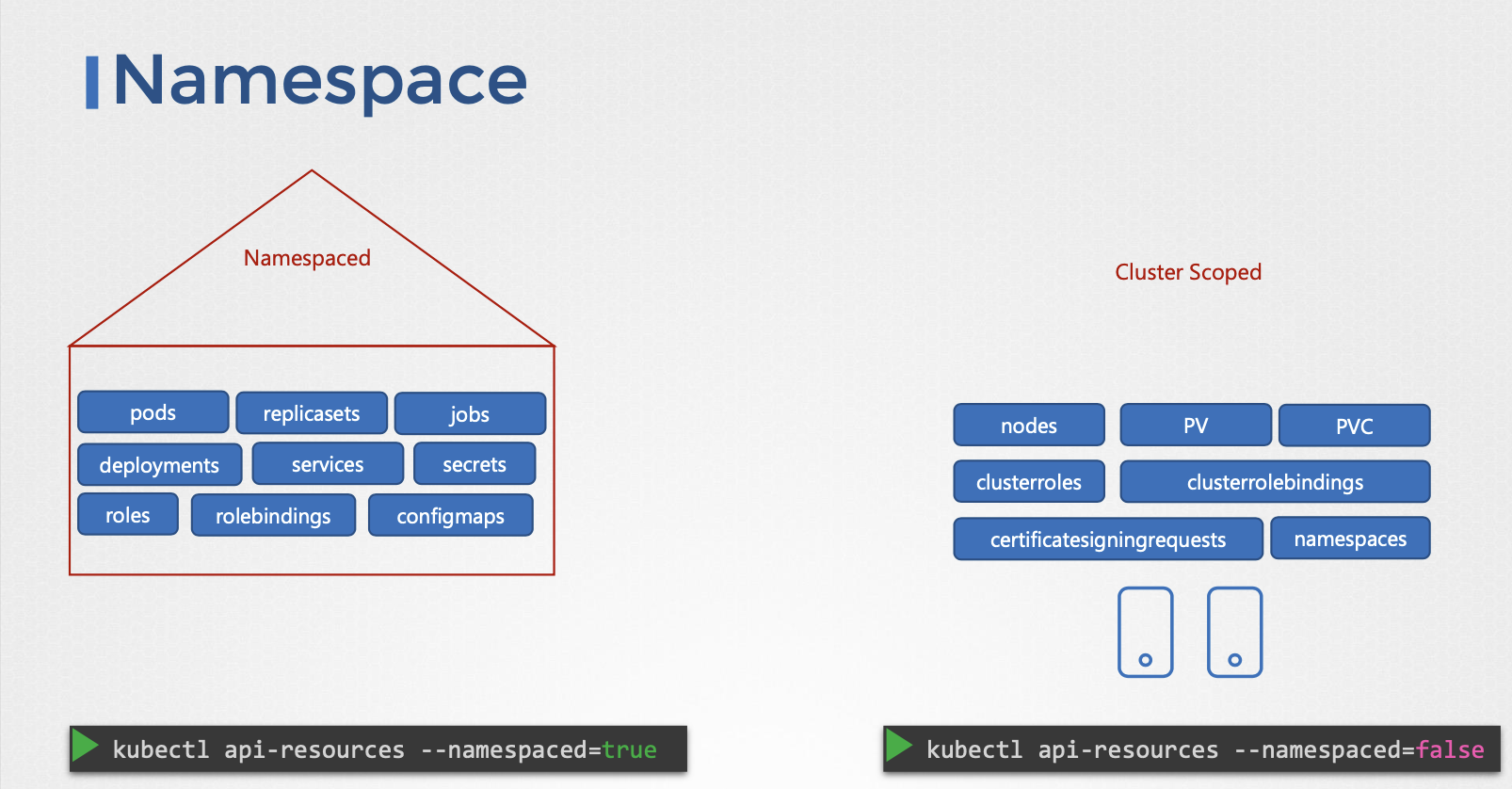 - 리소스는 네임스페이스 범위 또는 클러스터 범위로 분류된다.