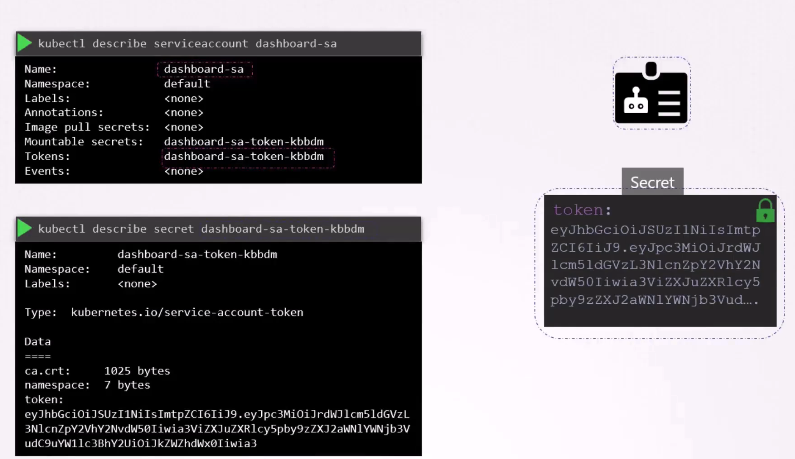 - 서비스 계정을 먼저 생성한 후 시크릿 객체를 생성해야 한다.