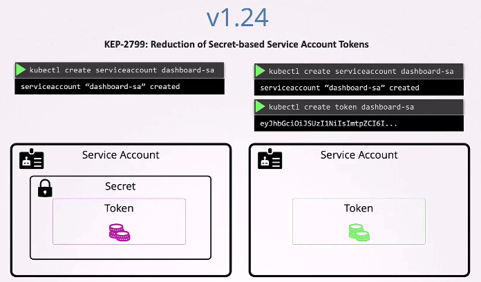 - 서비스 계정 생성 시 자동으로 시크릿 및 토큰이 생성되지 않는다. (KEP-2799)