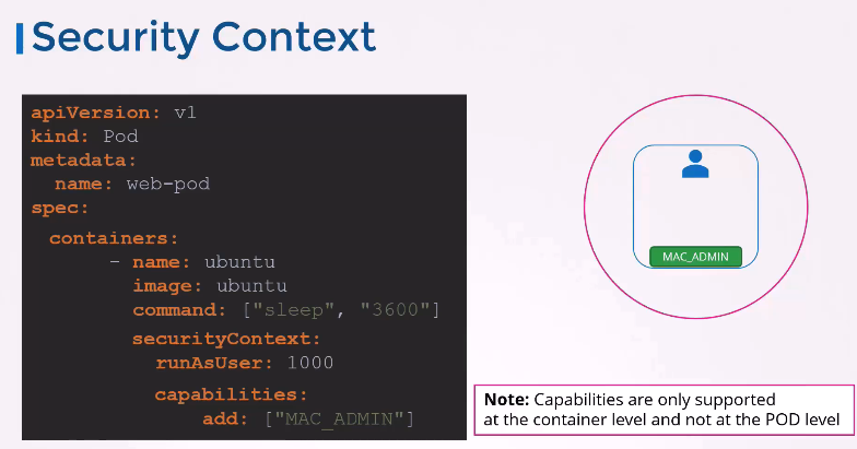 - 도커 컨테이너를 실행할 때 설정할 수 있는 다양한 보안 설정(사용자 ID, Linux Capabilities 등)을 쿠버네티스에서도 적용할 수 있다.