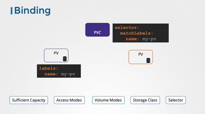 용량 확인: 쿠버네티스는 클레임에서 요청한 용량과 일치하거나 충분한 용량을 가진 영구 볼륨을 찾는다.