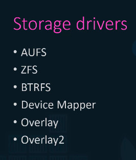 종류: AUFS, VTRFS, Device Mapper, Overlay, Overlay2 등